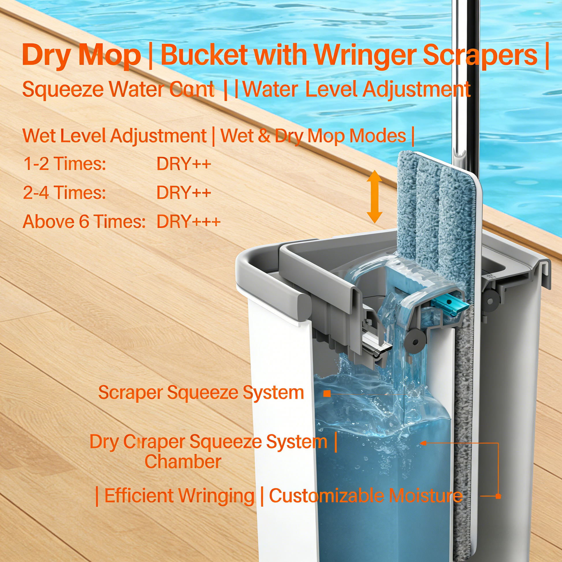 • Hygienic Self-Cleaning: Built-in bucket scraper removes dirt/hair; efficient wringing for customizable moisture